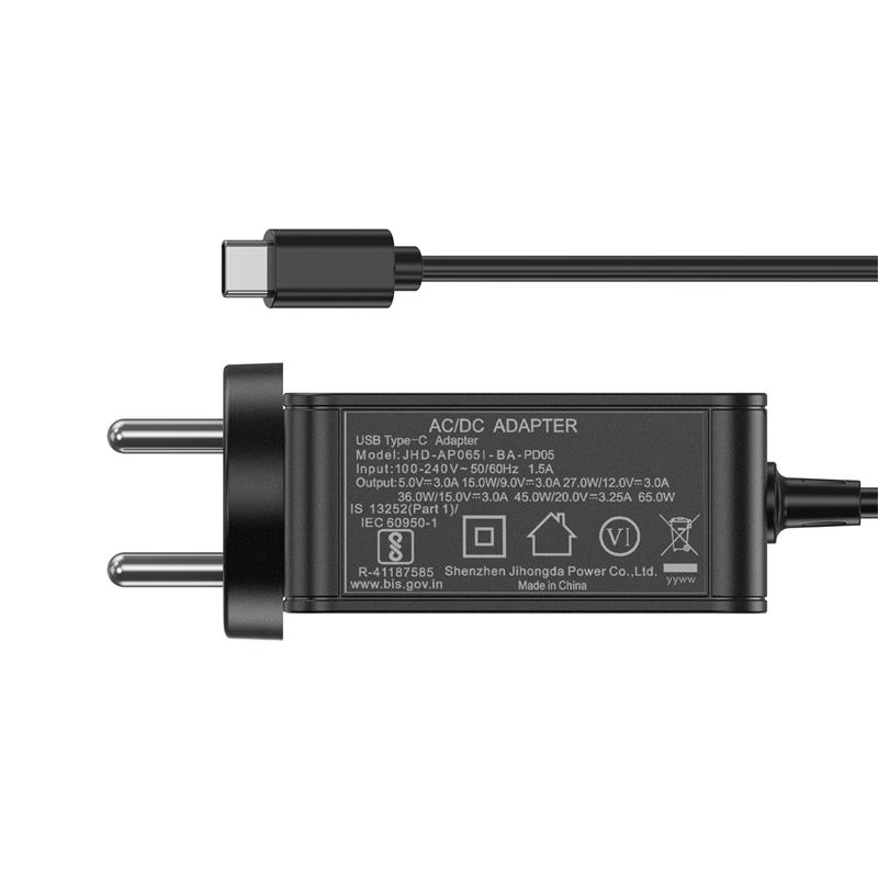 65W系列BIS认证印度规插脚PD USB Type C充电适配器。